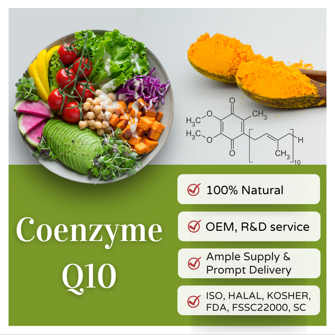 A coenzima Q10, também conhecida como CoQ10 ou ubiquinona 10, é um composto quinonóide extraído por fermentação microbiana. É uma 1,4-benzoquinona, onde Q se refere ao grupo químico quinona e 10 se refere ao número de subunidades químicas isoprenil em sua cauda. CoQ10 é um pó lipossolúvel de cor amarela ou organge, inodoro, fácil de ser decomposto à luz. O pó de CoQ10 ajuda a produzir trifosfato de adenosina (ATP), que está envolvido na transferência de energia dentro das células. Também serve como antioxidante e protege as células dos danos oxidativos.